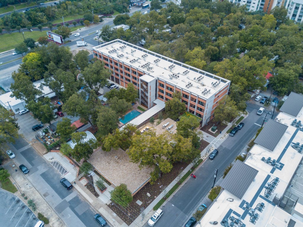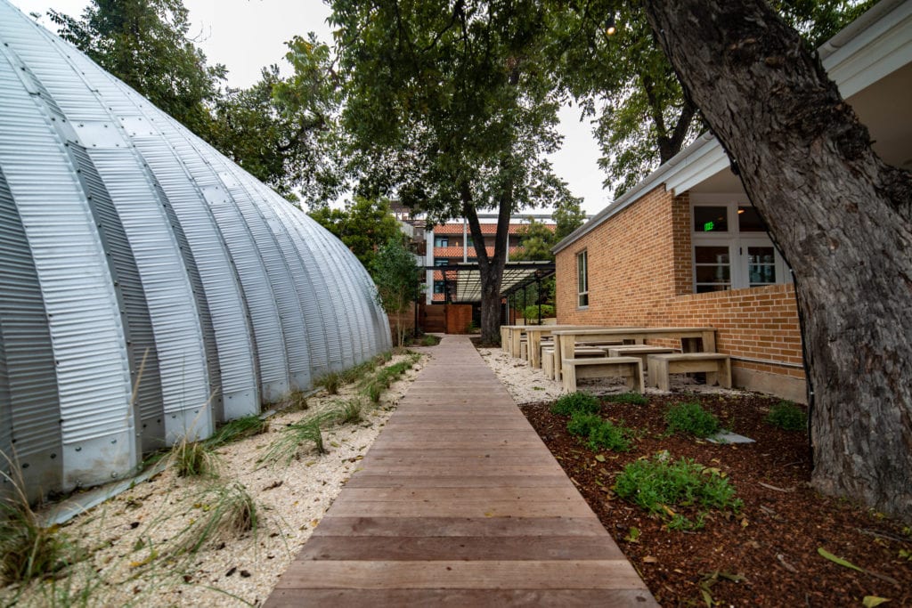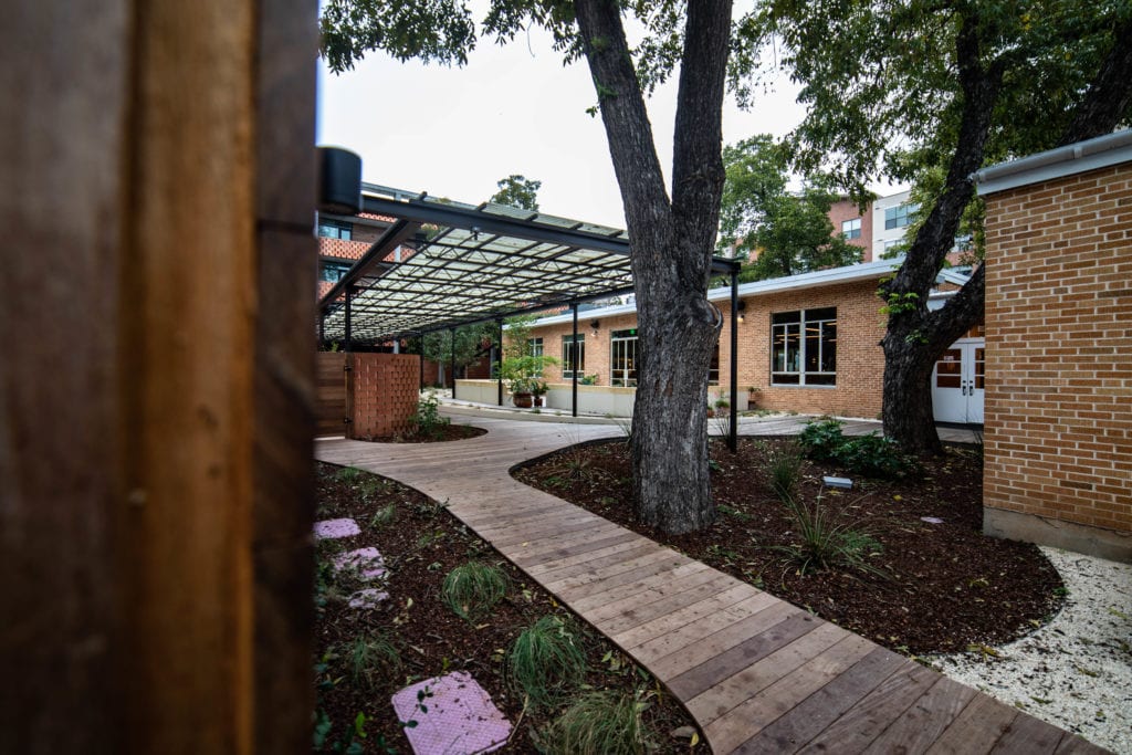 One major challenge Mighty Union faced was the heritage trees on the property. Austin has strict guidelines about removing or building near these natural historic landmarks, and although Mighty Union had to get approval to remove a couple of trees they were able to keep the rest intact without endangering the root system. The key to building the deck around the trees while preserving the roots was the use of a high-density polymer footing system called Tuffblock. The Tuffblock footing system can be placed directly on an even surface without any digging and can support over 1,700 lbs per footing. The end result was a gorgeous outdoor space that is a tribute to Austin's heritage and culture.