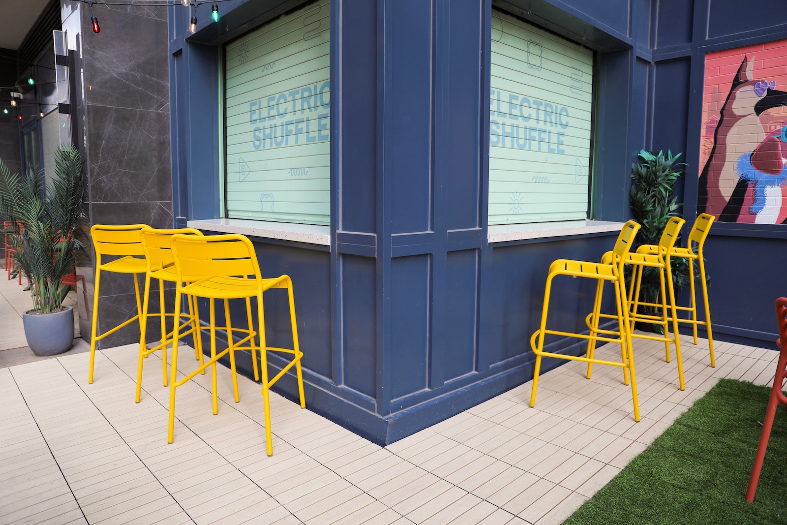 Electric Shuffle isn’t a quiet patio. It’s part of the night. People moving through, chairs sliding, drinks spilling. It sees real use every day, and the surface has to keep up.
