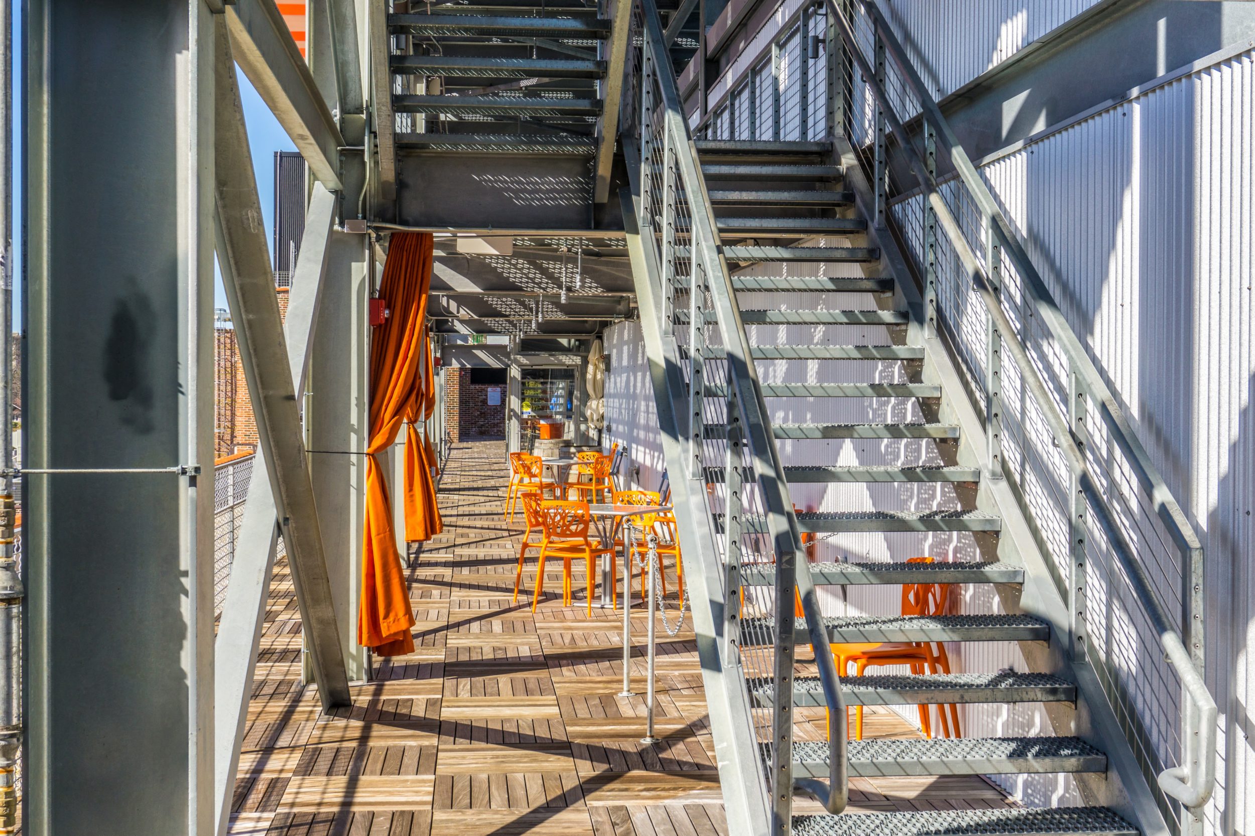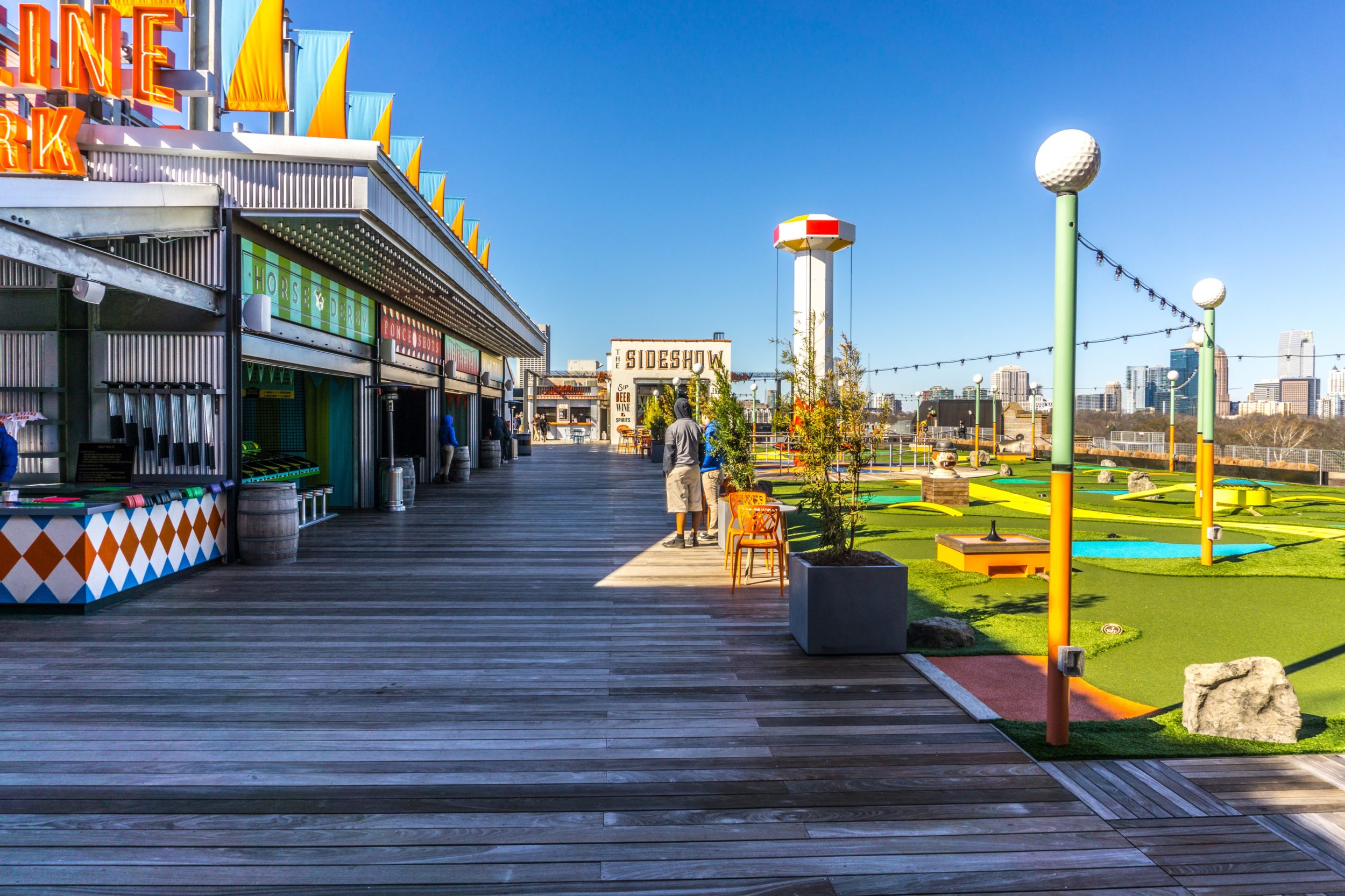 TimberTown also supplied wood for the rooftop deck called Skyline Park – Imagine a high-end carnival atmosphere with a breathtaking view of the city. Most of the rooftop is taken up with the mini golf course, but there are also several carnival games, rides, and options for food and drinks. The preserved brick walls combined with the brand-new deck and pops of color create a festive environment as visitors take in the sights, enjoy refreshments, and play a round of mini golf.