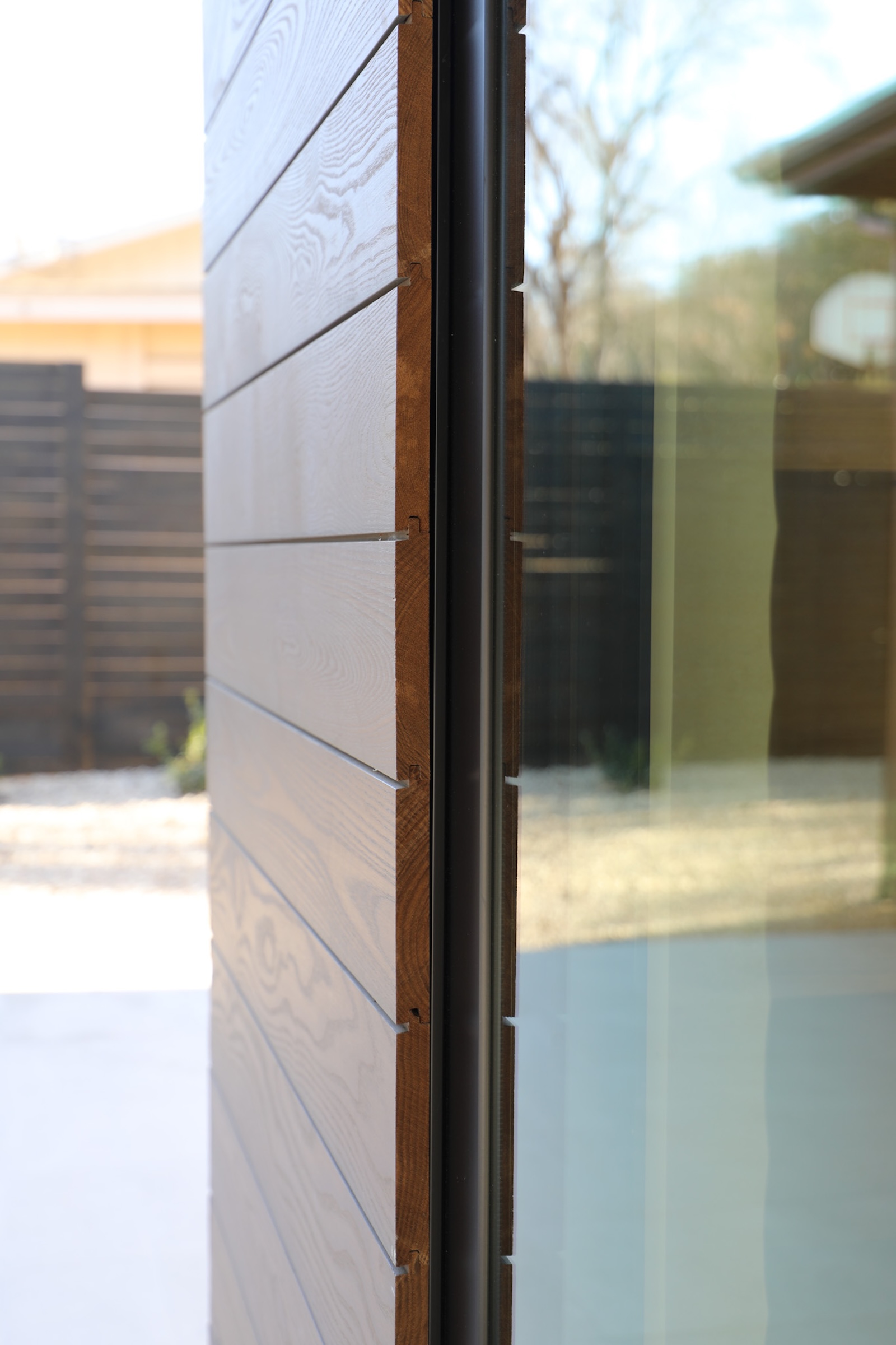 Installed vertically, the boards emphasize height and structure while the tonal variation within the Vivid Silver finish introduces depth without visual noise. The thermally modified ash provides improved dimensional stability and resistance to moisture movement, making it a smart solution not only in Central Texas but also in markets like Nashville and Atlanta where humidity, temperature swings, and seasonal expansion must be considered in exterior cladding design.