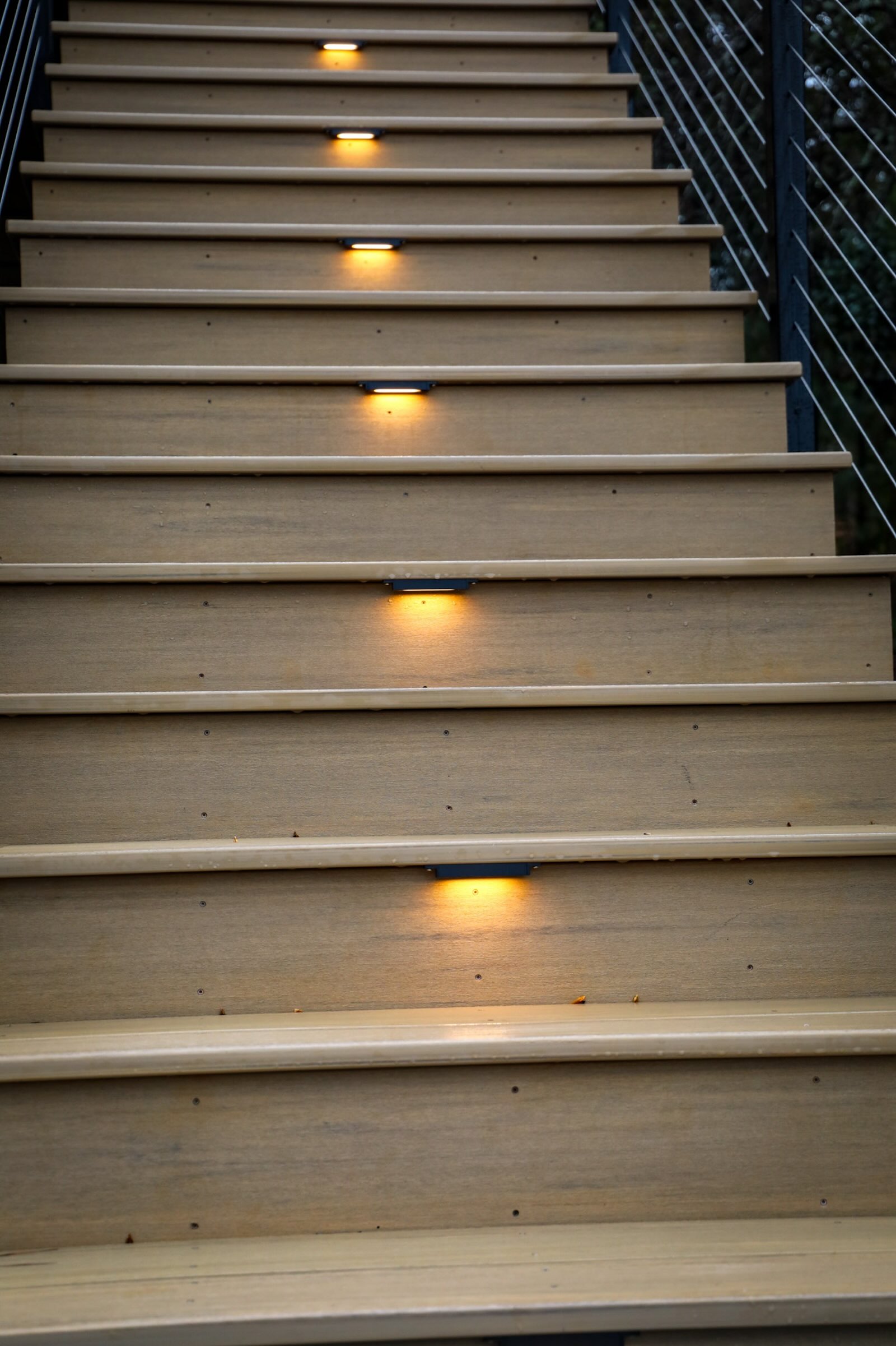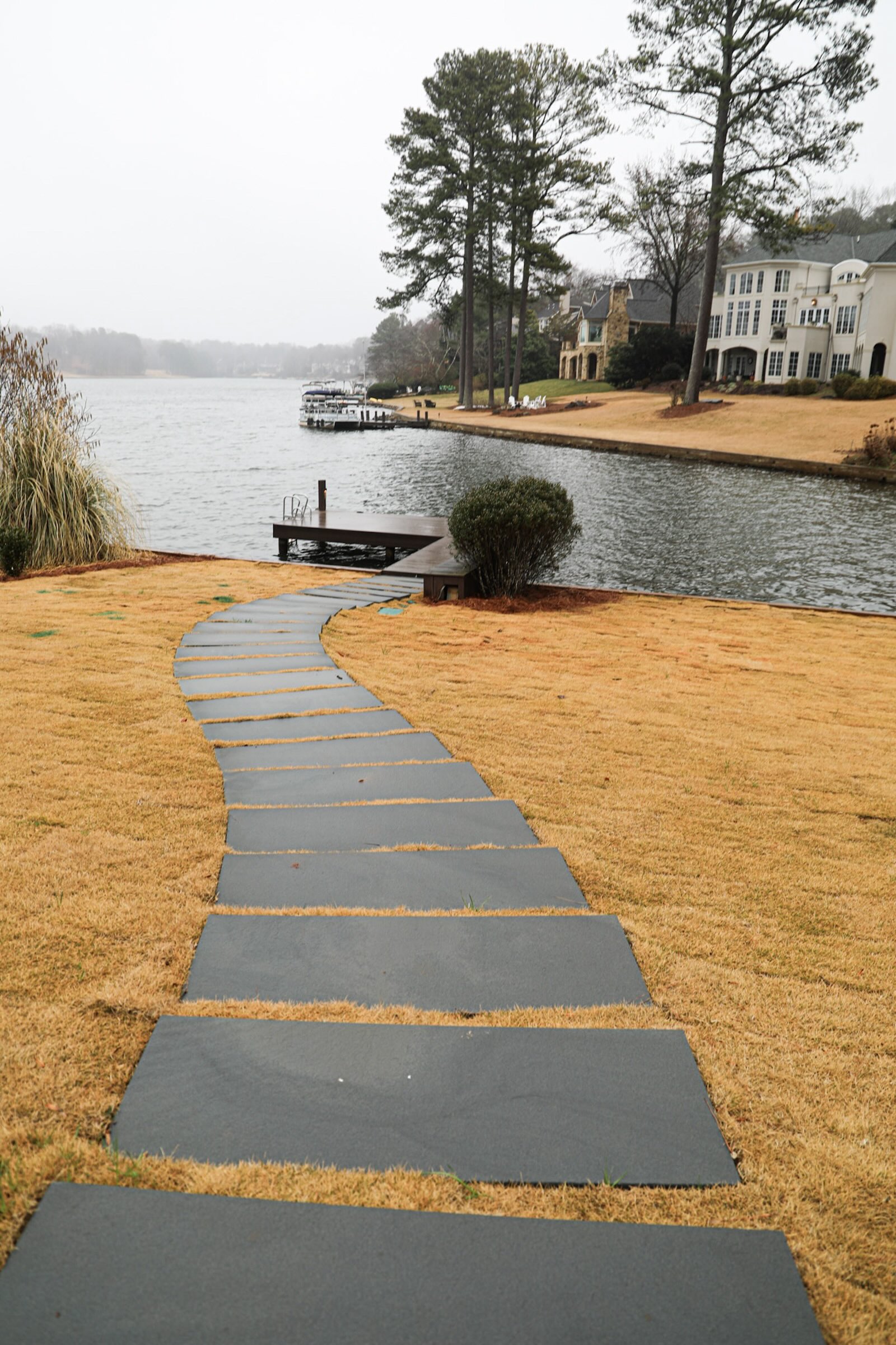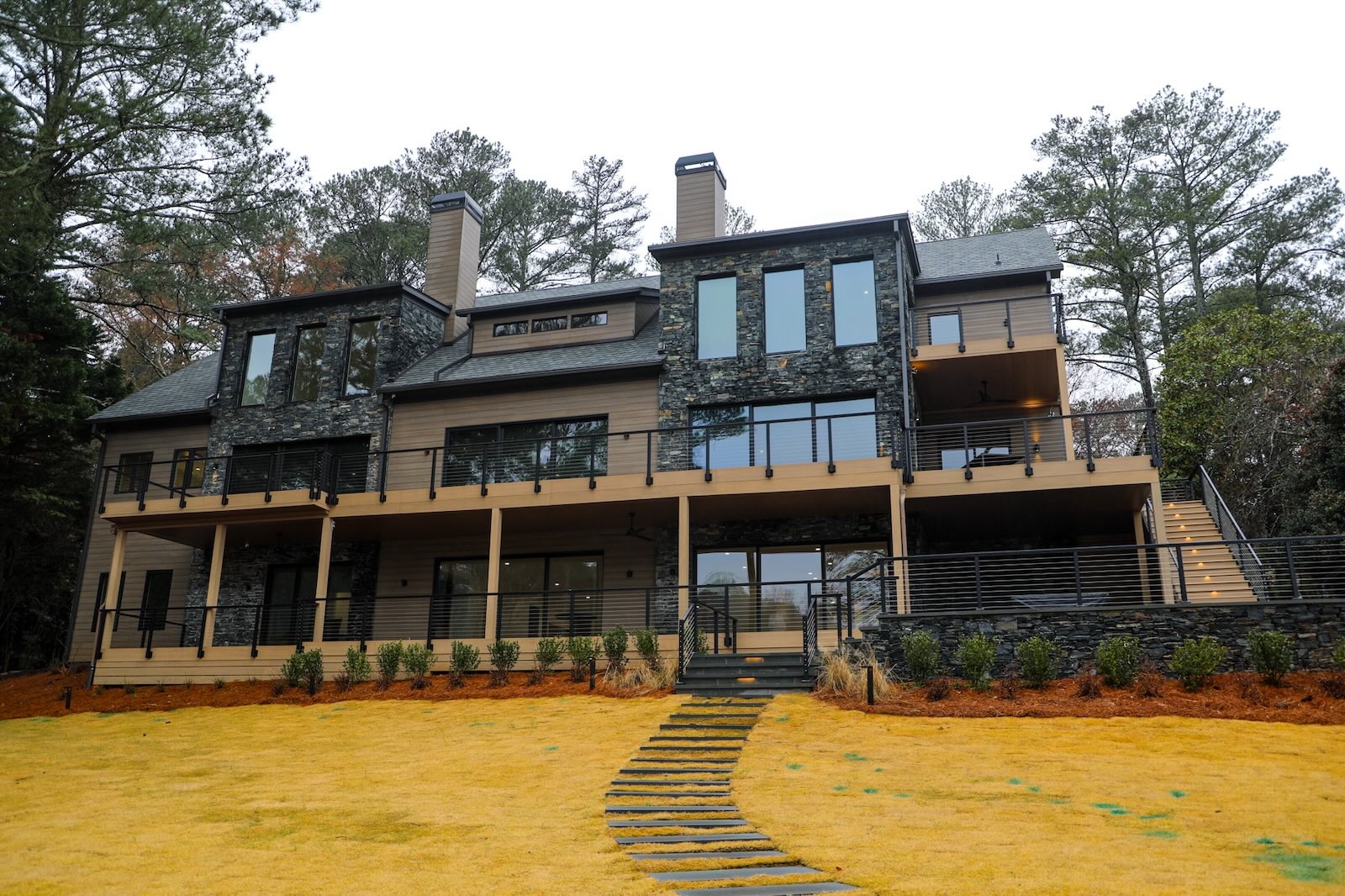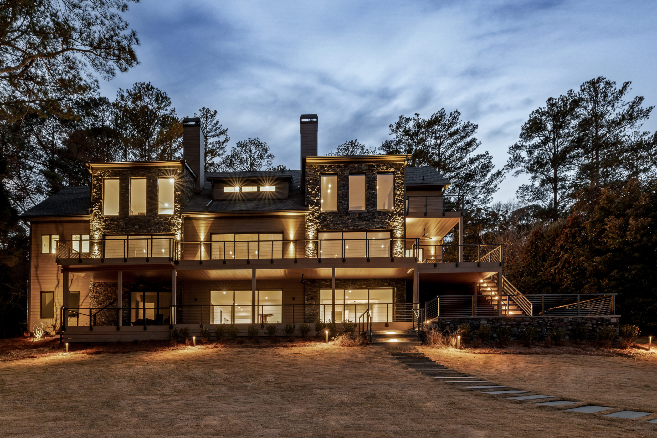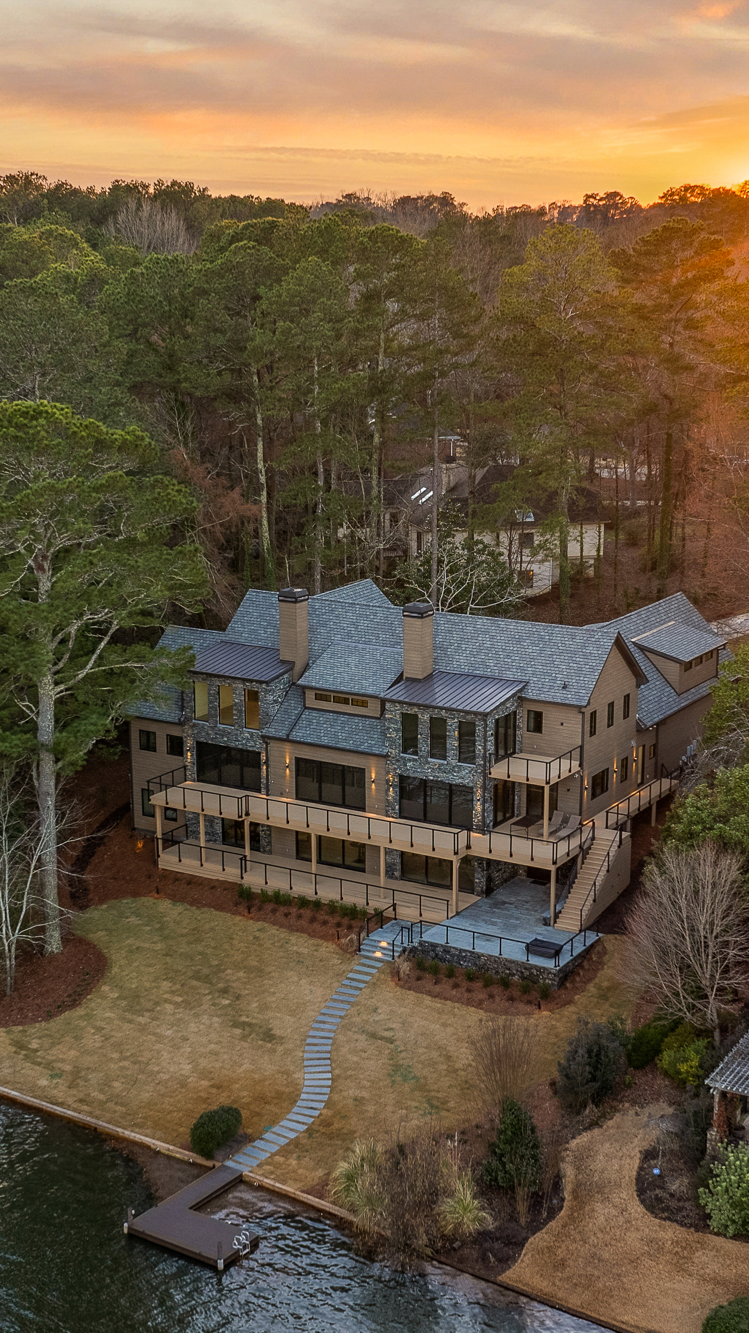 At the rear, expansive TimberTech decking extends from the main living areas toward the lake, unfolding across multiple levels that invite connection and ease. From sunlit mornings to evening gatherings, each terrace offers a unique vantage point to experience the landscape. The durable, low-maintenance decking was chosen for its balance of beauty and performance, providing a natural wood aesthetic that stands up to the elements year after year.