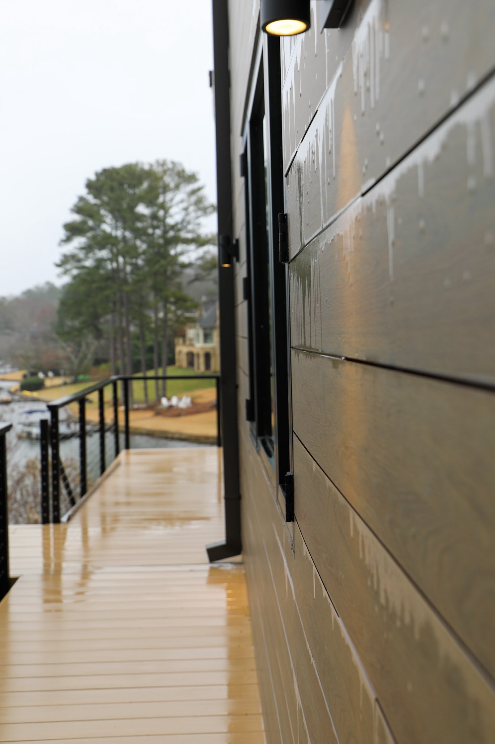 TimberTech decking and Trespa siding anchor this modern lakefront home by Boyce Design + Build, pairing high-performance materials with sculpted architecture and a tranquil lakeside setting.