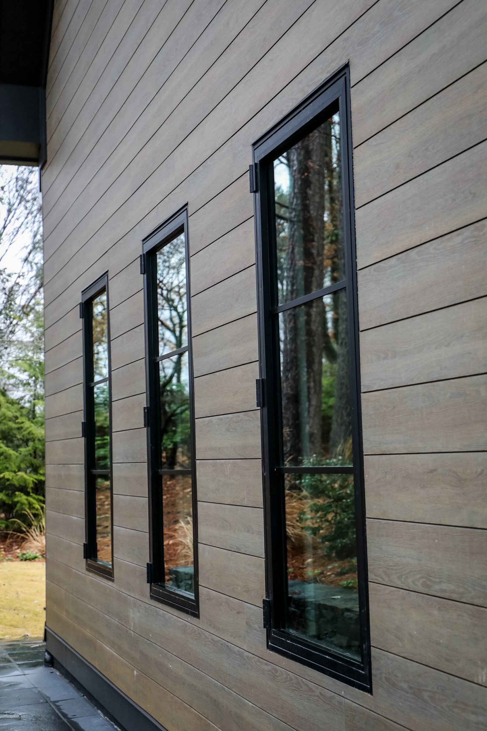 The exterior composition blends Trespa siding, natural stone, and black-framed windows in a palette that feels both grounded and contemporary. Wood-inspired panels bring warmth and depth against the clean geometry of the façade, while subtle shifts in proportion give the structure a sculptural presence. Every transition was carefully planned—a reflection of Boyce’s meticulous approach to design and build.